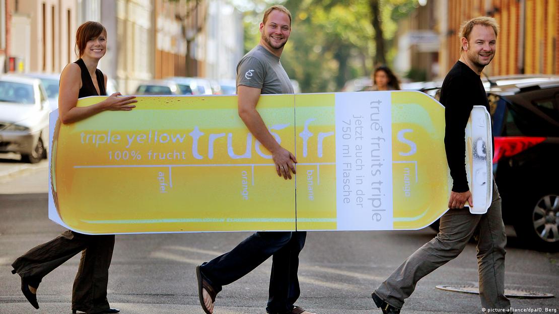 Οι ιδρυτές της True Fruits διαφημίζουν τα προϊόντα τους στη Βόννη το 2009