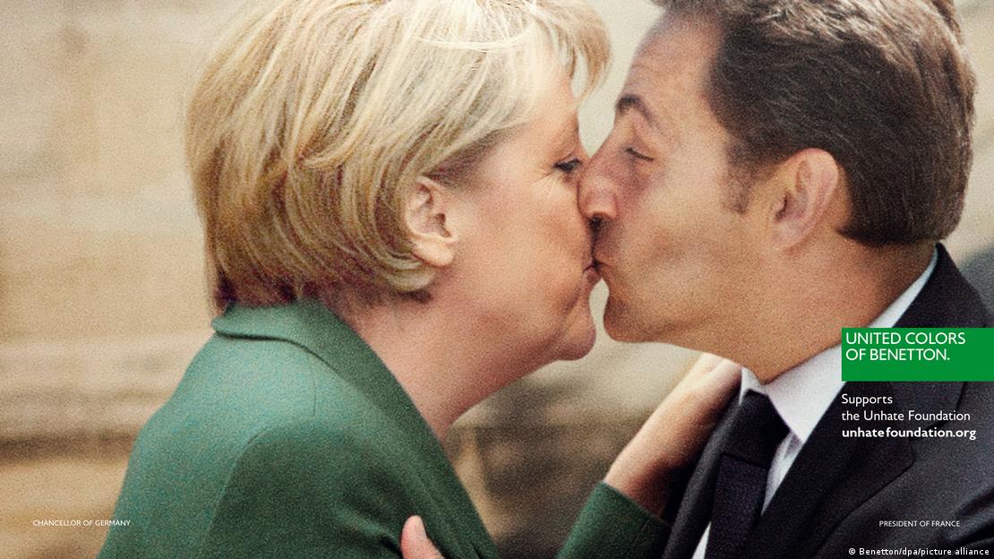 Φωτομοντάζ Μέρκελ και Σαρκοζί για διαφημιστικούς λόγους από την BenettonΑργότερα η Benetton προκάλεσε αίσθηση με μία ακόμα «προκλητική» διαφημιστική καμπάνια: σε μία συλλογή φωτομοντάζ απεικονιζόταν η Άνγκελα Μέρκελ να δίνει ένα φιλί στο στόμα στον Νικολά Σαρκοζί, αλλά και ο Πάπας Βενέδικτος σε περιπτύξεις με έναν ιμάμη.
