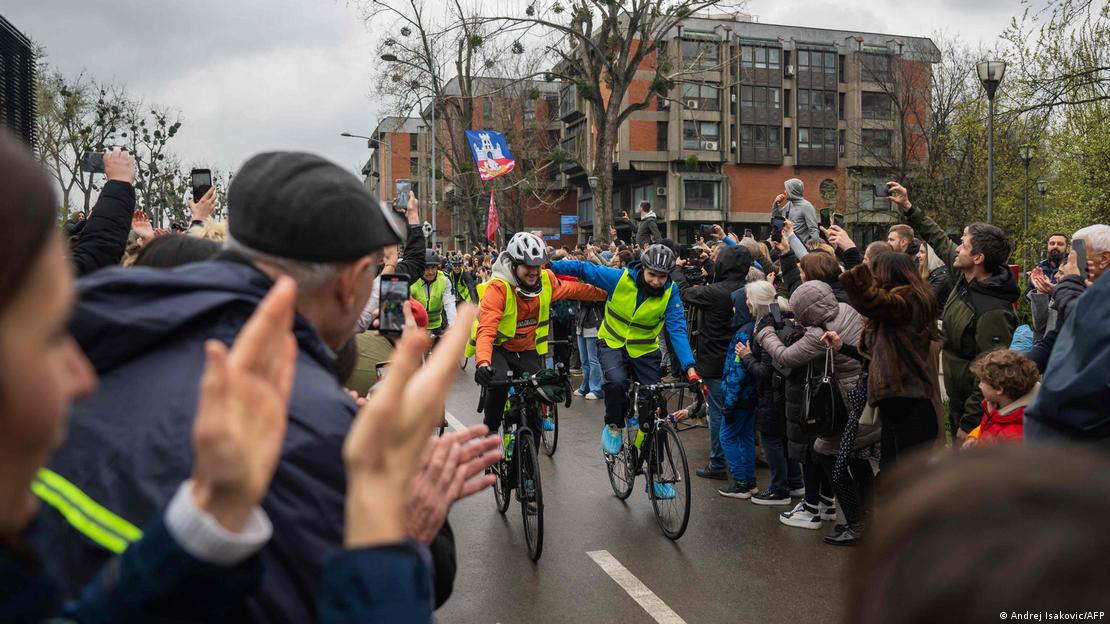 Σέρβοι φοιτητές φεύγουν με ποδήλατα από το Νόβι Σαντ για το ΣτρασβούργοΟ καθηγητής Μίχιτς αντιθέτως πιστεύει πως οι μέρες του κυβερνώντος SNS είναι μετρημένες. «Τα αυταρχικά καθεστώτα γίνονται πάντοτε όλο και πιο καταπιεστικά και επιθετικά προς το τέλος της εξουσίας τους. Η καταπίεση αυτή θα πρέπει στην πραγματικότητα να μας ενθαρρύνει, διότι δείχνει πως το καθεστώς είναι στα τελευταία του. Πιστεύω πως δεν θα επιβιώσει τους επόμενους μήνες», δηλώνει ο Μίχιτς στην DW.