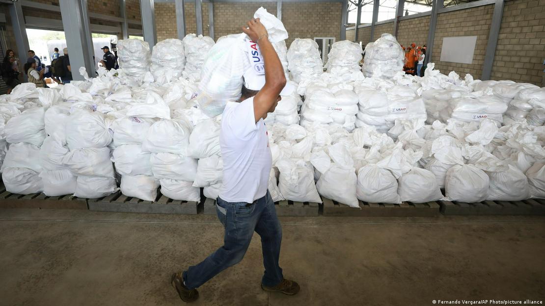 Εθελοντής μεταφέρει τρόφιμα της USAID στα σύνορα Κολομβίας-Βενεζουέλας