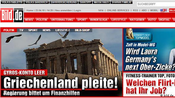 Προαναγγελία χρεοκοπίας από την Bild με φόντο τον ΠαρθενώναΕικόνα: bild.deΤη σκυτάλη παίρνει η Bild. Τον Απρίλιο του 2010, με φόντο μία μεγαλοπρεπή φωτογραφία του Παρθενώνα, ενημερώνει τους αναγνώστες της ότι «η Ελλάδα χρεοκόπησε» και «η κυβέρνηση παρακαλάει για βοήθεια». Τον Οκτώβριο, παραμονή μίας κρίσιμης επίσκεψης Παπανδρέου στο Βερολίνο και ενώ έχει ήδη ψηφιστεί το πρώτο μνημόνιο, η Bild θα ζητήσει από τους «μπατίρηδες Έλληνες» να «πουλήσουν τα νησιά τους» για να ξεχρεώσουν.