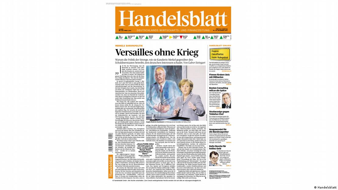 Λίγο αργότερα όμως η οικονομική επιθεώρηση Handelsblatt αλλάζει το κλίμα με πρωτοσέλιδο άρθρο του αρχισυντάκτη Γκαμπόρ Στάινχαρτ και τίτλο «Βερσαλλίες χωρίς πόλεμο». Για πρώτη φορά η καγκελάριος Άνγκελα Μέρκελ κατηγορείται για μία «πολιτική ισχύος» απέναντι στις χώρες της κρίσης, «που βλάπτει τα γερμανικά συμφέροντα». Μεταξύ άλλων, διαβάζουμε: «Οι Έλληνες καλούνται να εξοικονομήσουν το 14% του ΑΕΠ μέχρι το 2014. Αν μπορούσε να επιτευχθεί αυτό, θα είναι η μεγαλύτερη εξοικονόμηση που έχει επιτύχει μία χώρα εν καιρώ ειρήνης. Όποιος μετατρέπει τις χώρες-οφειλέτες σε προτεκτοράτο, θα δρέψει τη διχόνοια».