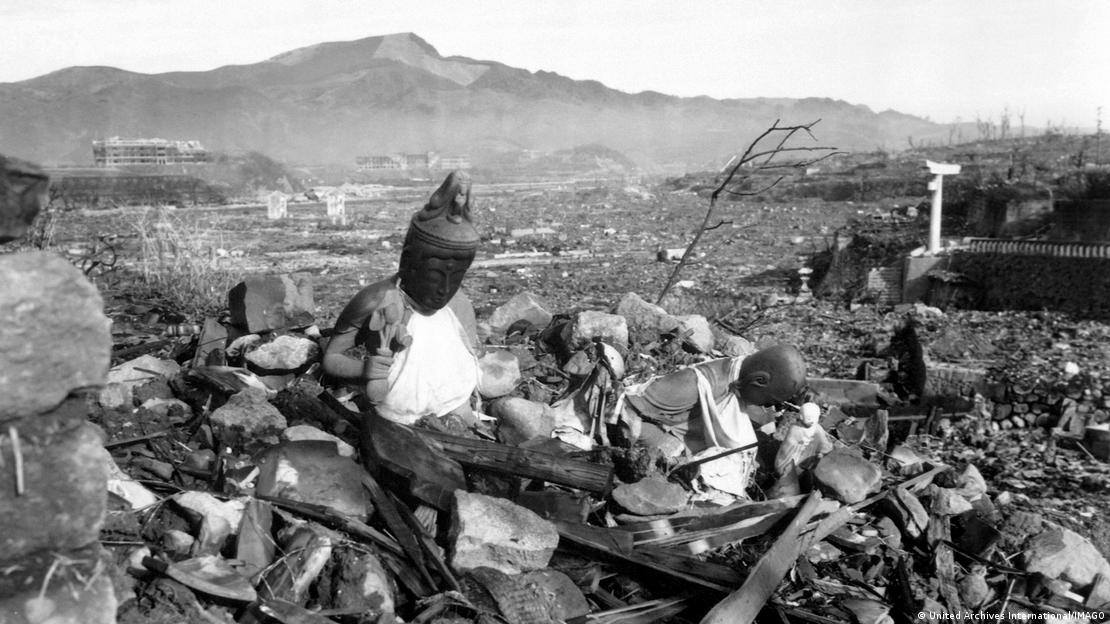 Κατεστραμμένος βουδιστικός ναός στην Ιαπωνία, 9 Αυγούστου 1945Τρεις μέρες μετά τον εφιάλτη της Χιροσίμα, ακολούθησε το Ναγκασάκι. Μετά την πρώτη ατομική βόμβα με την κωδική ονομασία «Little Boy», ακολούθησε η δεύτερη, ο «Fat Man». Και στο Ναγκασάκι περίπου 80.000 άνθρωποι πέθαναν είτε άμεσα είτε αργότερα, με καρκίνο, λευχαιμία και άλλες ασθένειες που συνδέονται με τη ραδιενέργεια.