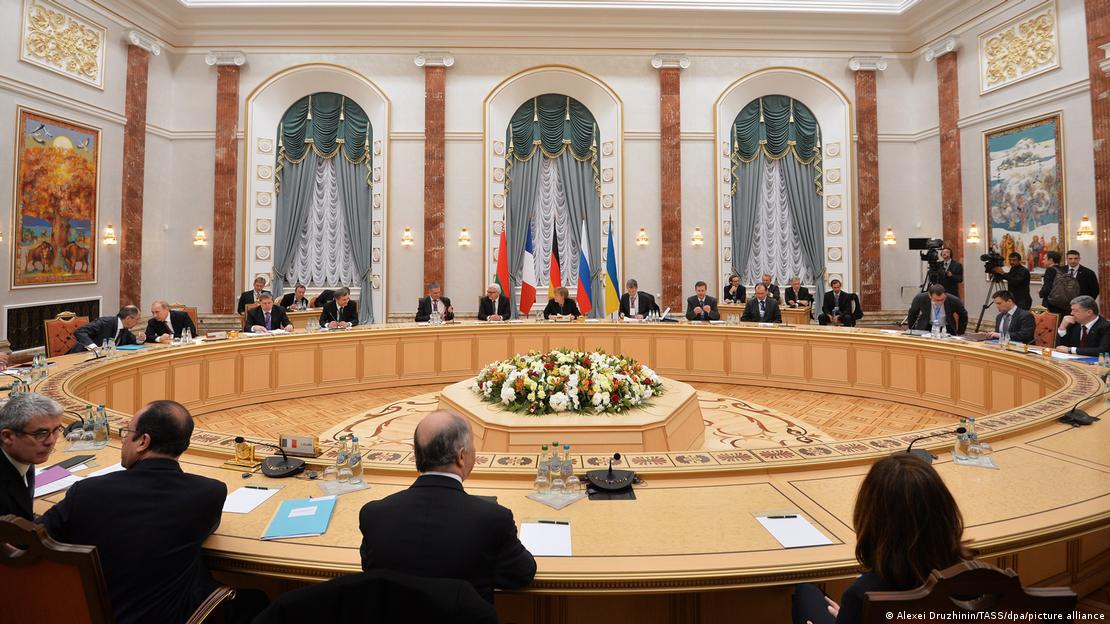 Από τις διαπραγματεύσεις για τη Συμφωνία του Μινσκ, 2015Η Άνγκελα Μέρκελ θυμάται: «τον Ιούνιο του 2021, ένιωσα ότι πλέον ο Πούτιν δεν παίρνει στα σοβαρά τη Συμφωνία του Μινσκ. Ήθελα ένα νέο διαπραγματευτικό σχήμα, στο οποίο θα μπορούσαμε να μιλήσουμε με τον Πούτιν απευθείας ως ΕΕ».