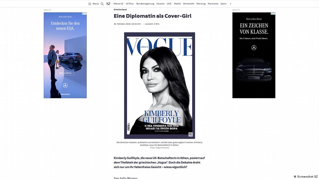 Η Süddeutsche Zeitung αναφέρεται στη νέα πρέσβειρα των ΗΠΑ στην Ελλάδα Κίμπερλι Γκίλφοϊλ, με αφορμή το επίκαιρο αφιέρωμα της ελληνικής VOGUE. «Μία διπλωμάτης ως cover-girl» είναι ο τίτλος και η εφημερίδα του Μονάχου εξηγεί ότι «αυτήν την εβδομάδα η Κίμπερλι Γκίλφοϊλ αναλαμβάνει καθήκοντα ως πρέσβειρα των ΗΠΑ στην Αθήνα και συστήνεται στους Έλληνες ως το κορίτσι του εξωφύλλου στην τελευταία VOGUE».