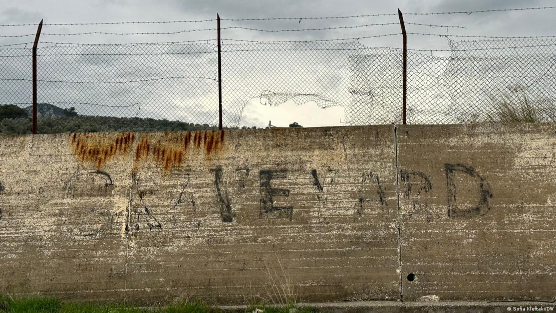 Συρματόπλεγμα εξακολουθεί να περιβάλλει τον χώρο της πρώην προσφυγικής δομής στη Μόρια της Λέσβου. Σιωπή παντού. Στους εξωτερικούς τοίχους διακρίνονται ακόμη ξεθωριασμένα γκράφιτι στα αγγλικά: «Graveyard», «#MeMoria», «Welcome to Europe». Δύο αστέρια είναι ζωγραφισμένα δίπλα στις λέξεις, λυπημένα.