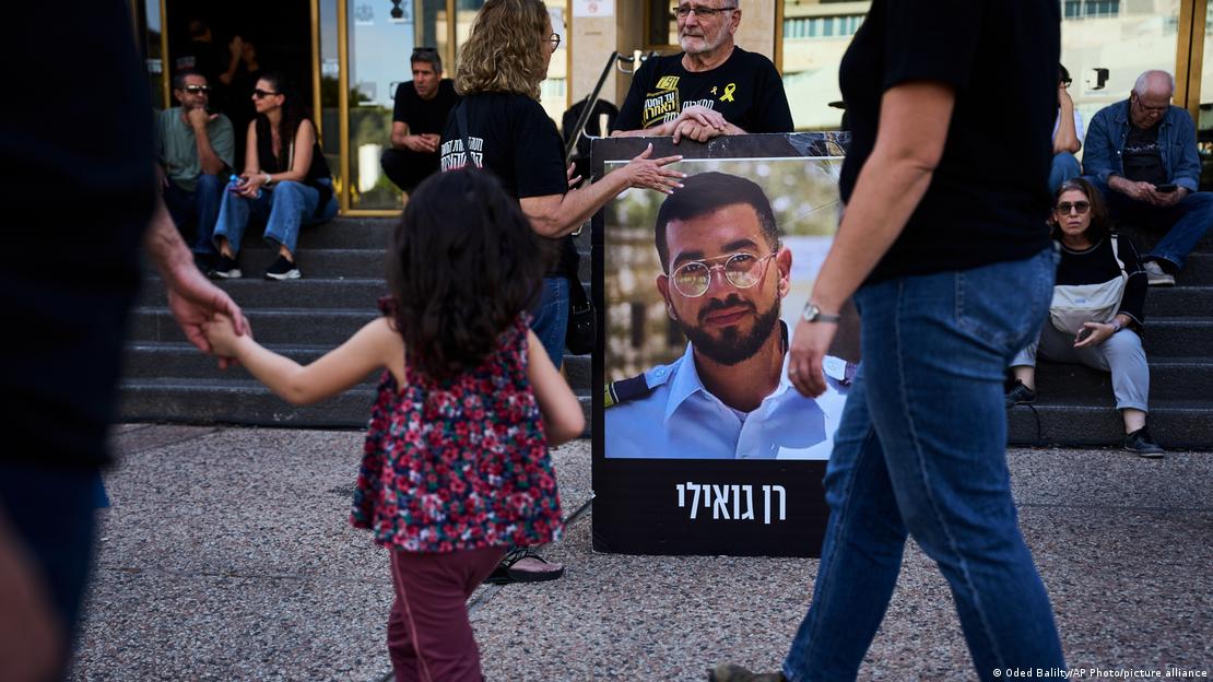 Διαδηλωτές κρατούν τη φωτογραφία του Ραν Γβίλι, ισραηλινού ομήρου που εκτελέστηκε από την Χαμάς